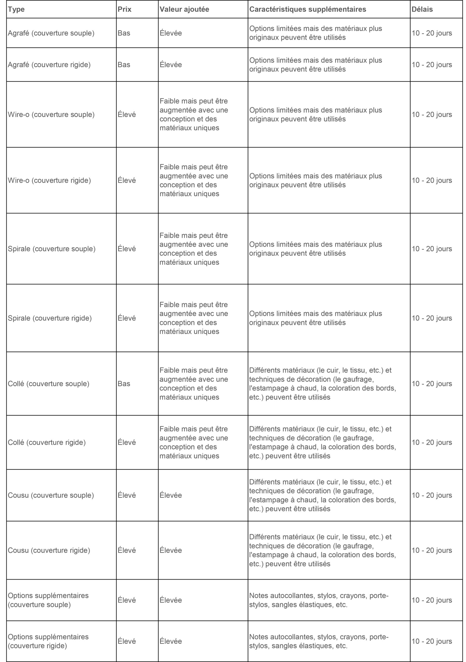 Vous pouvez choisir entre une reliure à spirale, agrafée, collée ou cousue s’ouvrant horizontalement ou verticalement. La couverture peut être souple ou cartonnée, recouverte de tissu ou de cuir.